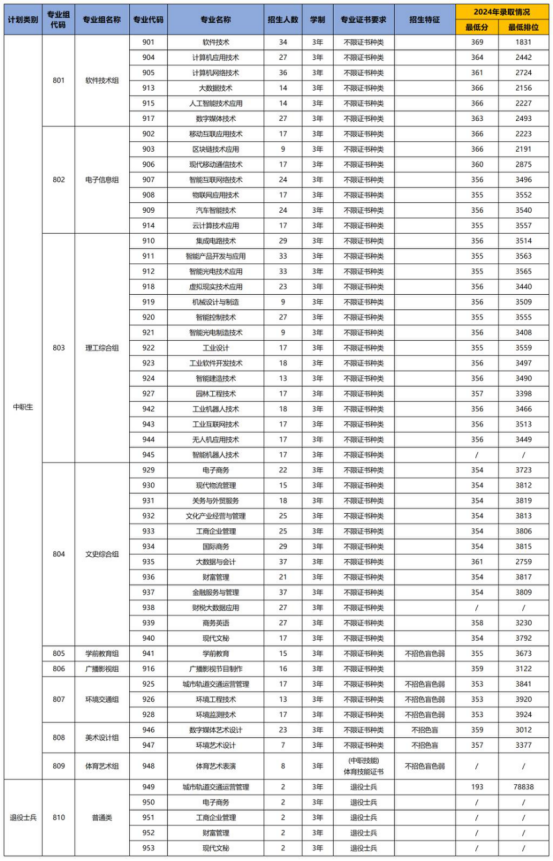 深圳信息职业技术学院2025年广东省春季高考招生(依学考成绩招生、“3+证书”招生)计划2800人,其中依学考成绩招生1800人,“3+证书”招生1000人。依学考成绩招生专业组分为普通类8组、美术类1组、体育类1组;“3+证书”招生专业组分为中职生类9组、退役士兵类1组。